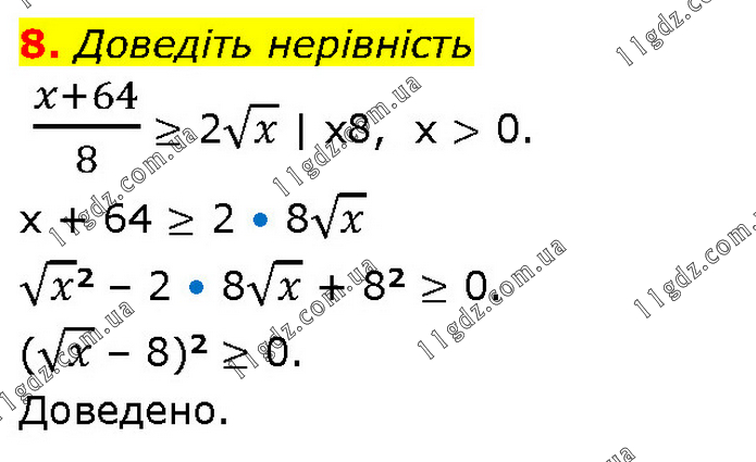 8. Доведіть нерівність (x+64)/8 ≥ 2√x | x8, x > 0. x + 64 ≥ 2 • 8√x √x2 – 2 • 8√x + 82 ≥ 0. (√x – 8)2 ≥ 0. Доведено.
