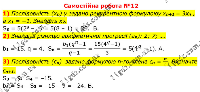Самостійна робота №12 1) Послідовність (xn) y задано рекурентною формулоюy xn+1 = 3xn , а x1 = −1. Знайдіть x2. S3 = 5(23 – 1) = 5(8 – 1) = 35. B. 2) Знайдіть різницю арифметичної прогресії (an): 2; 7; …. b1 = 15. q = 4. Sn = (b_1 (q^n-1)/(q-1) = (15(4^q-1))/3 = 5(4^q – 1). A. 3) Послідовність (cn) задано формулою n-го члена cn = 3n/5. Визначте cn+1. S3 = 9. S4 = –15. b4 = S4 – S3 = –15 – 9 = –24. Б.