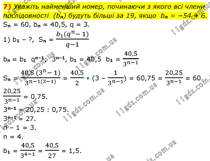 Укажіть найменший номер, починаючи з якого всі члени послідовності (bn) будуть більші за 19, якщо bn = −54 + 6. Sn = 60, bn = 40,5, q = 3. 1) b1 – ?, Sn = (b_1 (q^n- 1))/(q-1) bn = b1 qn–1; 3n–1, b1 = 40,5 b1 = 40,5/3^(n-1) Sn = (40,5 (3^n- 1))/3^(n-1(3-1)) = 40,5/2 • (3 – 1/3^(n-1) ) = 60,75 = 20,25/3^(n-1) = 60. 20,25/3^(n-1) = 0,75. 3n–1 = 20,25 : 0,75. 3n–1 = 27. n – 1 = 3. n = 4. b1 = 40,5/3^(4-1) = 40,5/27 = 1,5.