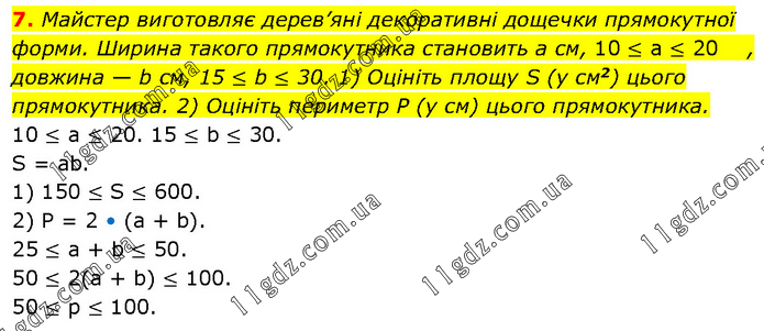 Майстер виготовляє дерев’яні декоративні дощечки прямокутної форми. Ширина такого прямокутника становить a см, 10 ≤ a ≤ 20 , довжина — b см, 15 ≤ b ≤ 30. 1) Оцініть площу S (у см2) цього прямокутника. 2) Оцініть периметр P (у см) цього прямокутника. 10 ≤ a ≤ 20. 15 ≤ b ≤ 30. S = ab. 1) 150 ≤ S ≤ 600. 2) P = 2 • (a + b). 25 ≤ a + b ≤ 50. 50 ≤ 2(a + b) ≤ 100. 50 ≤ p ≤ 100.