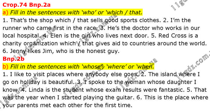 Стор.74 Впр.2a a) Fill in the sentences with ‘who’ or ‘which / that. 1. That’s the shop which / that sells good sports clothes. 2. I’m the runner who came first in the race. 3. He’s the doctor who works in our local hospital. 4. Elen is the girl who lives next door. 5. Red Cross is a charity organization which / that gives aid to countries around the world. 6. Jenny likes Jim, who is the honest guy. Впр.2b b) Fill in the sentences with ‘whose’, ‘where’ or ‘when. 1. I like to visit places where anybody else goes. 2. The island where I go on holiday is beautiful. 3. I spoke to the woman whose daughter I know. 4. Linda is the student whose exam results were fantastic. 5. That was the year when I started playing the guitar. 6. This is the place where your parents met each other for the first time.