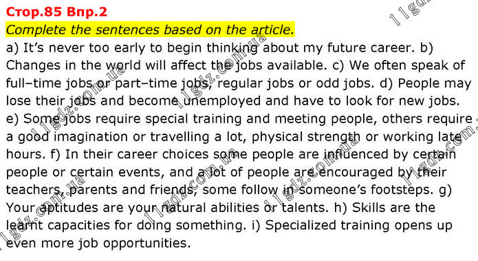 Стор.85 Впр.2 Complete the sentences based on the article. a) It’s never too early to begin thinking about my future career. b) Changes in the world will affect the jobs available. c) We often speak of full–time jobs or part–time jobs, regular jobs or odd jobs. d) People may lose their jobs and become unemployed and have to look for new jobs. e) Some jobs require special training and meeting people, others require a good imagination or travelling a lot, physical strength or working late hours. f) In their career choices some people are influenced by certain people or certain events, and a lot of people are encouraged by their teachers, parents and friends, some follow in someone’s footsteps. g) Your aptitudes are your natural abilities or talents. h) Skills are the learnt capacities for doing something. i) Specialized training opens up even more job opportunities.