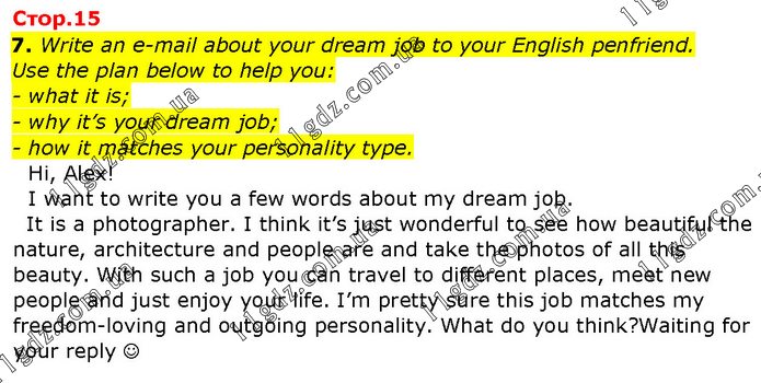 Write an e-mail about your dream job to your English penfriend. Use the plan below to help you: - what it is; - why it’s your dream job; - how it matches your personality type. Hi, Alex! I want to write you a few words about my dream job. It is a photographer. I think it’s just wonderful to see how beautiful the nature, architecture and people are and take the photos of all this beauty. With such a job you can travel to different places, meet new people and just enjoy your life. I’m pretty sure this job matches my freedom-loving and outgoing personality. What do you think?Waiting for your reply