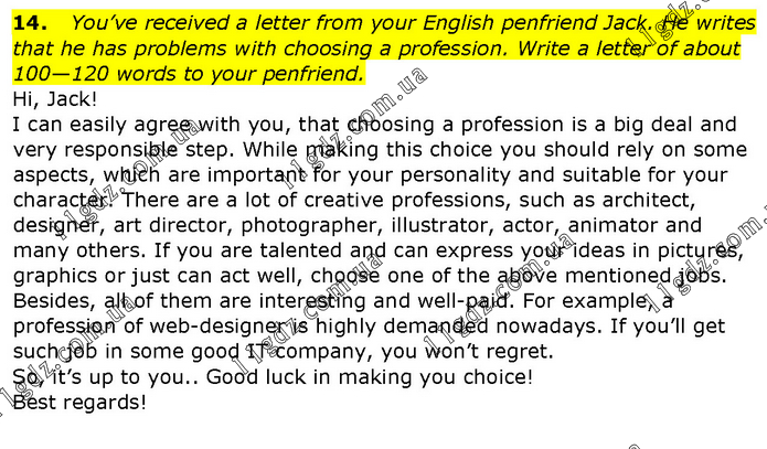 14. You’ve received a letter from your English penfriend Jack. He writes that he has problems with choosing a profession. Write a letter of about 100—120 words to your penfriend. Hi, Jack! I can easily agree with you, that choosing a profession is a big deal and very responsible step. While making this choice you should rely on some aspects, which are important for your personality and suitable for your character. There are a lot of creative professions, such as architect, designer, art director, photographer, illustrator, actor, animator and many others. If you are talented and can express your ideas in pictures, graphics or just can act well, choose one of the above mentioned jobs. Besides, all of them are interesting and well-paid. For example, a profession of web-designer is highly demanded nowadays. If you’ll get such job in some good IT company, you won’t regret. So, it’s up to you.. Good luck in making you choice! Best regards!