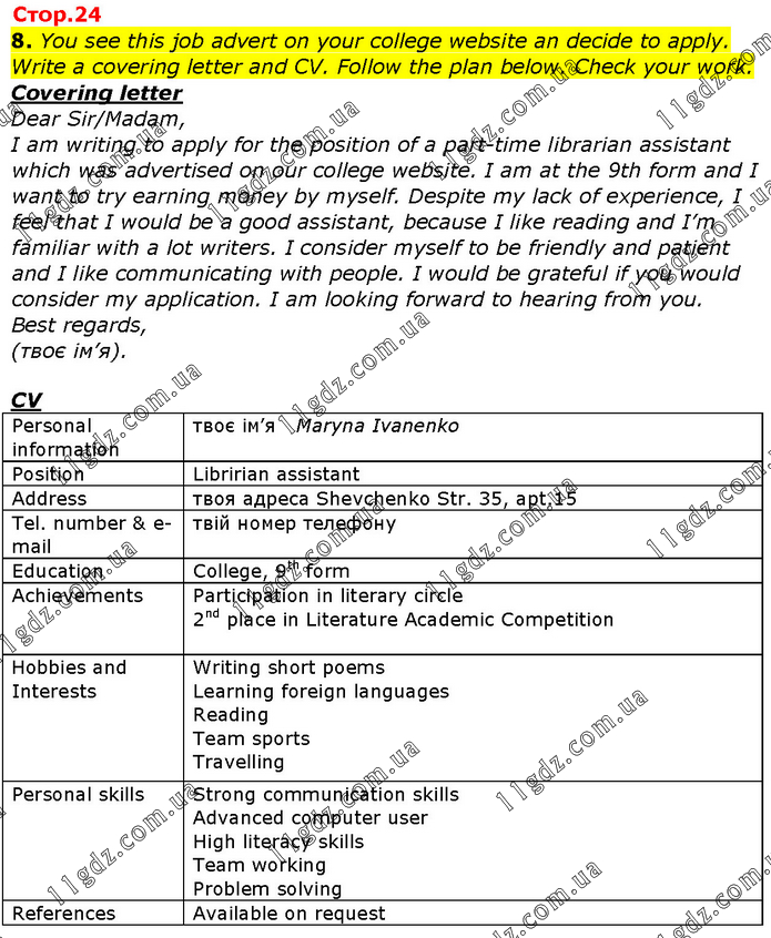 You see this job advert on your college website an decide to apply. Write a covering letter and CV. Follow the plan below. Check your work. Covering letter Dear Sir/Madam, I am writing to apply for the position of a part-time librarian assistant which was advertised on our college website. I am at the 9th form and I want to try earning money by myself. Despite my lack of experience, I feel that I would be a good assistant, because I like reading and I’m familiar with a lot writers. I consider myself to be friendly and patient and I like communicating with people. I would be grateful if you would consider my application. I am looking forward to hearing from you. Best regards, (твоє ім’я).