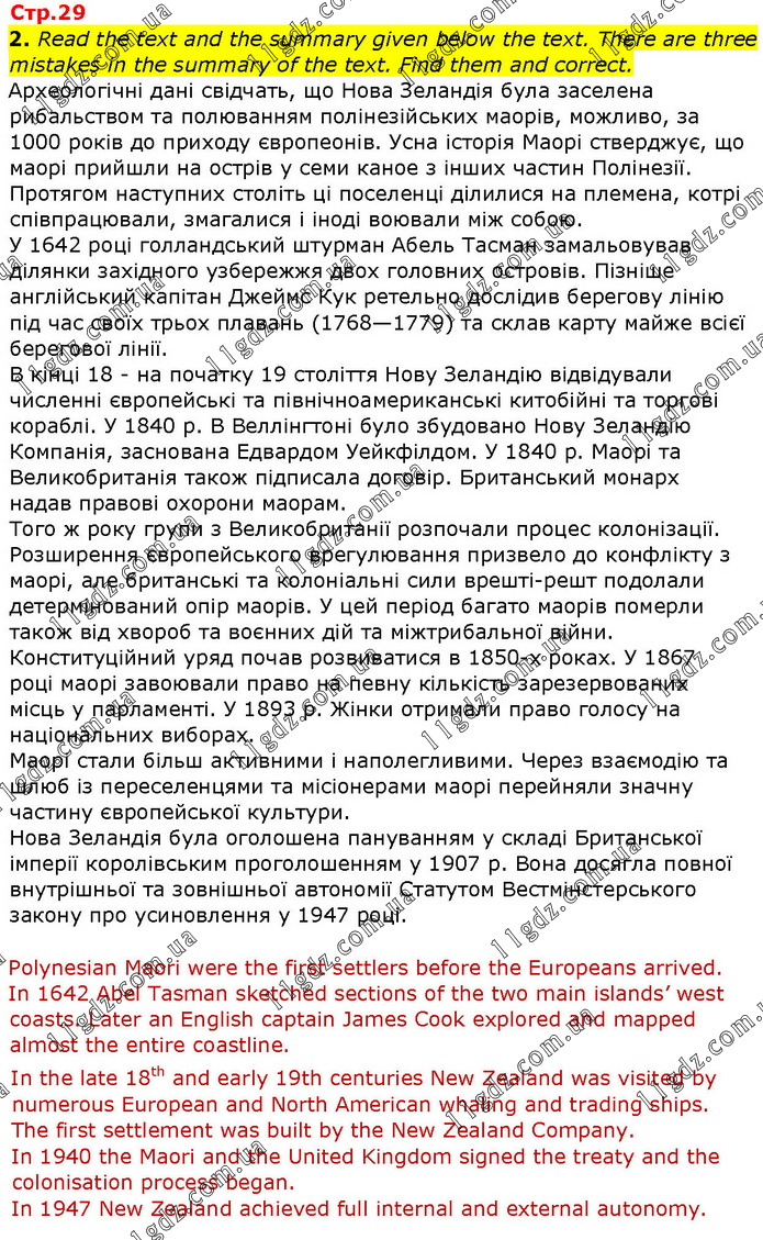 Read the text and the summary given below the text. There are three mistakes in the summary of the text. Find them and correct. Археологічні дані свідчать, що Нова Зеландія була заселена рибальством та полюванням полінезійських маорів, можливо, за 1000 років до приходу європеонів. Усна історія Маорі стверджує, що маорі прийшли на острів у семи каное з інших частин Полінезії. Протягом наступних століть ці поселенці ділилися на племена, котрі співпрацювали, змагалися і іноді воювали між собою. У 1642 році голландський штурман Абель Тасман замальовував ділянки західного узбережжя двох головних островів. Пізніше англійський капітан Джеймс Кук ретельно дослідив берегову лінію під час своїх трьох плавань (1768—1779) та склав карту майже всієї берегової лінії. В кінці 18 - на початку 19 століття Нову Зеландію відвідували численні європейські та північноамериканські китобійні та торгові кораблі. У 1840 р. В Веллінгтоні було збудовано Нову Зеландію Компанія, заснована Едвардом Уейкфілдом. У 1840 р. Маорі та Великобританія також підписала договір. Британський монарх надав правові охорони маорам. Того ж року групи з Великобританії розпочали процес колонізації. Розширення європейського врегулювання призвело до конфлікту з маорі, але британські та колоніальні сили врешті-решт подолали детермінований опір маорів. У цей період багато маорів померли також від хвороб та воєнних дій та міжтрибальної війни. Конституційний уряд почав розвиватися в 1850-х роках. У 1867 році маорі завоювали право на певну кількість зарезервованих місць у парламенті. У 1893 р. Жінки отримали право голосу на національних виборах. Маорі стали більш активними і наполегливими. Через взаємодію та шлюб із переселенцями та місіонерами маорі перейняли значну частину європейської культури. Нова Зеландія була оголошена пануванням у складі Британської імперії королівським проголошенням у 1907 р. Вона досягла повної внутрішньої та зовнішньої автономії Статутом Вестмінстерського закону про усиновлення у 1947 році. Polynesian Maori were the first settlers before the Europeans arrived. In 1642 Abel Tasman sketched sections of the two main islands’ west coasts. Later an English captain James Cook explored and mapped almost the entire coastline. In the late 18th and early 19th centuries New Zealand was visited by numerous European and North American whaling and trading ships. The first settlement was built by the New Zealand Company. In 1940 the Maori and the United Kingdom signed the treaty and the colonisation process began. In 1947 New Zealand achieved full internal and external autonomy.
