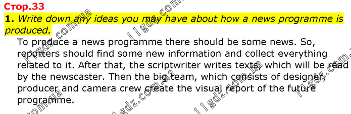 Write down any ideas you may have about how a news programme is produced. To produce a news programme there should be some news. So, reporters should find some new information and collect everything related to it. After that, the scriptwriter writes texts, which will be read by the newscaster. Then the big team, which consists of designer, producer and camera crew create the visual report of the future programme.