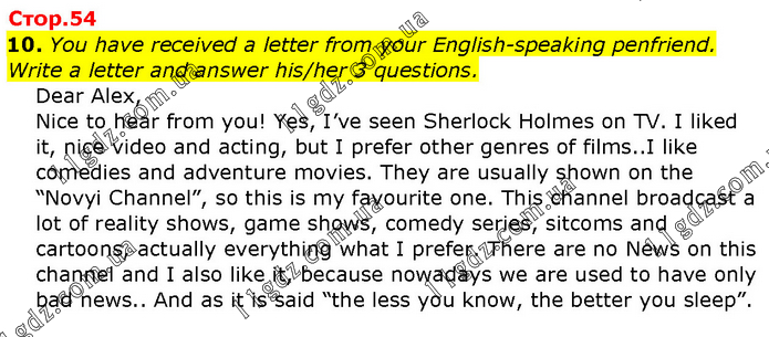 You have received a letter from your English-speaking penfriend. Write a letter and answer his/her 3 questions. Dear Alex, Nice to hear from you! Yes, I’ve seen Sherlock Holmes on TV. I liked it, nice video and acting, but I prefer other genres of films..I like comedies and adventure movies. They are usually shown on the “Novyi Channel”, so this is my favourite one. This channel broadcast a lot of reality shows, game shows, comedy series, sitcoms and cartoons, actually everything what I prefer. There are no News on this channel and I also like it, because nowadays we are used to have only bad news.. And as it is said “the less you know, the better you sleep”.
