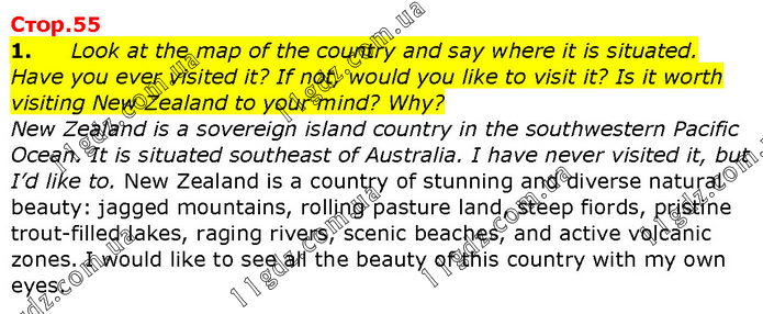1. Look at the map of the country and say where it is situated. Have you ever visited it? If not, would you like to visit it? Is it worth visiting New Zealand to your mind? Why? New Zealand is a sovereign island country in the southwestern Pacific Ocean. It is situated southeast of Australia. I have never visited it, but I’d like to. New Zealand is a country of stunning and diverse natural beauty: jagged mountains, rolling pasture land, steep fiords, pristine trout-filled lakes, raging rivers, scenic beaches, and active volcanic zones. I would like to see all the beauty of this country with my own eyes.
