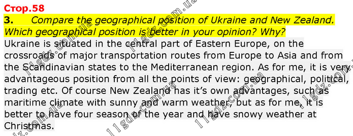 3. Compare the geographical position of Ukraine and New Zealand. Which geographical position is better in your opinion? Why? Ukraine is situated in the central part of Eastern Europe, on the crossroads of major transportation routes from Europe to Asia and from the Scandinavian states to the Mediterranean region. As for me, it is very advantageous position from all the points of view: geographical, political, trading etc. Of course New Zealand has it’s own advantages, such as maritime climate with sunny and warm weather, but as for me, it is better to have four season of the year and have snowy weather at Christmas.
