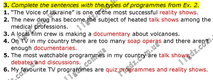 3. Complete the sentences with the types of programmes from Ex. 2. 1. “The Voice of Ukraine” is one of the most successful reality shows. 2. The new drug has become the subject of heated talk shows among the medical professions. 3. A local film crew is making a documentary about volcanoes. 4. On TV in my country there are too many soap operas and there aren’t enough documentaries. 5. The most watchable programmes in my country are talk shows, debates and discussions. 6. My favourite TV programmes are quiz programmes and reality shows.