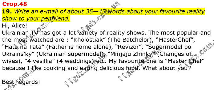 Write an e-mail of about 35—45 words about your favourite reality show to your penfriend. Hi, Alice! Ukrainian TV has got a lot variety of reality shows. The most popular and the most watched are : “Kholostiak” (The Batchelor), “MasterChef”, “Hata na Tata” (Father is home alone), “Revizor”, “Supermodel po Ukrains’ky” (Ukrainian supermodel), “Minjaju Zhinky” (Changes of wives), “4 vesillia” (4 weddings) etc. My favourite one is “Master Chef” because I like cooking and eating delicious food. What about you? Best regards!