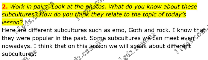 Work in pairs. Look at the photos. What do you know about these subcultures? How do you think they relate to the topic of today’s lesson? Here are different subcultures such as emo, Goth and rock. I know that they were popular in the past. Some subcultures we can meet even nowadays. I think that on this lesson we will speak about different subcultures.