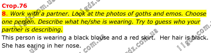 Work with a partner. Look at the photos of goths and emos. Choose one person. Describe what he/she is wearing. Try to guess who your partner is describing. This person is wearing a black blouse and a red skirt. Her hair is black. She has earing in her nose.