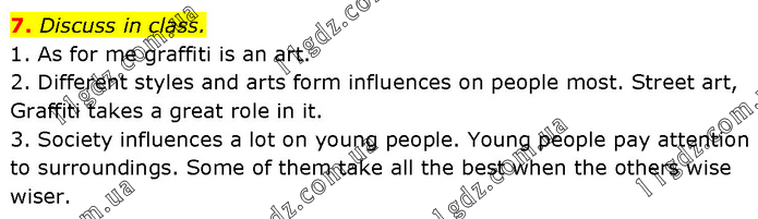 Discuss in class. 1. As for me graffiti is an art. 2. Different styles and arts form influences on people most. Street art, Graffiti takes a great role in it. 3. Society influences a lot on young people. Young people pay attention to surroundings. Some of them take all the best when the others wise wiser.