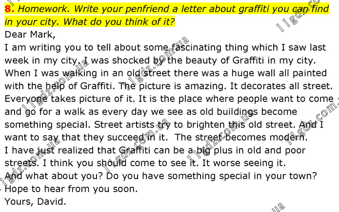 Homework. Write your penfriend a letter about graffiti you can find in your city. What do you think of it? Dear Mark, I am writing you to tell about some fascinating thing which I saw last week in my city. I was shocked by the beauty of Graffiti in my city. When I was walking in an old street there was a huge wall all painted with the help of Graffiti. The picture is amazing. It decorates all street. Everyone takes picture of it. It is the place where people want to come and go for a walk as every day we see as old buildings become something special. Street artists try to brighten this old street. And I want to say that they succeed in it. The street becomes modern. I have just realized that Graffiti can be a big plus in old and poor streets. I think you should come to see it. It worse seeing it. And what about you? Do you have something special in your town? Hope to hear from you soon. Yours, David.