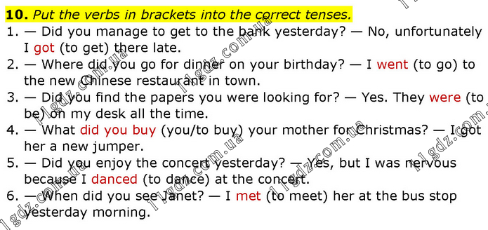 Put the verbs in brackets into the correct tenses. 1. — Did you manage to get to the bank yesterday? — No, unfortunately I got (to get) there late. 2. — Where did you go for dinner on your birthday? — I went (to go) to the new Chinese restaurant in town. 3. — Did you find the papers you were looking for? — Yes. They were (to be) on my desk all the time. 4. — What did you buy (you/to buy) your mother for Christmas? — I got her a new jumper. 5. — Did you enjoy the concert yesterday? — Yes, but I was nervous because I danced (to dance) at the concert. 6. — When did you see Janet? — I met (to meet) her at the bus stop yesterday morning.