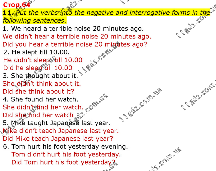Put the verbs into the negative and interrogative forms in the following sentences. 1. We heard a terrible noise 20 minutes ago. We didn’t hear a terrible noise 20 minutes ago. Did you hear a terrible noise 20 minutes ago? 2. He slept till 10.00. He didn’t sleep till 10.00 Did he sleep till 10.00 3. She thought about it. She didn’t think about it. Did she think about it? 4. She found her watch. She didn’t find her watch. Did she find her watch 5. Mike taught Japanese last year. Mike didn’t teach Japanese last year. Did Mike teach Japanese last year? 6. Tom hurt his foot yesterday evening. Tom didn’t hurt his foot yesterday. Did Tom hurt his foot yesterday?