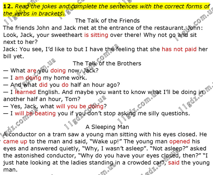 Read the jokes and complete the sentences with the correct forms of the verbs in brackets. The Talk of the Friends The friends John and Jack met at the entrance of the restaurant. John: Look, Jack, your sweetheart is sitting over there! Why not go and sit next to her? Jack: You see, I’d like to but I have the feeling that she has not paid her bill yet. The Talk of the Brothers — What are you doing now, Jack? — I am doing my home work. — And what did you do half an hour ago? — I learned English. And maybe you want to know what I’ll be doing in another half an hour, Tom? — Yes, Jack, what will you be doing? — I will be beating you if you don’t stop asking me silly questions. A Sleeping Man A conductor on a tram saw a young man sitting with his eyes closed. He came up to the man and said, “Wake up!” The young man opened his eyes and answered quietly, “Why, I wasn’t asleep”. “Not asleep?” asked the astonished conductor, “Why do you have your eyes closed, then?” “I just hate looking at the ladies standing in a crowded car”, said the young man.