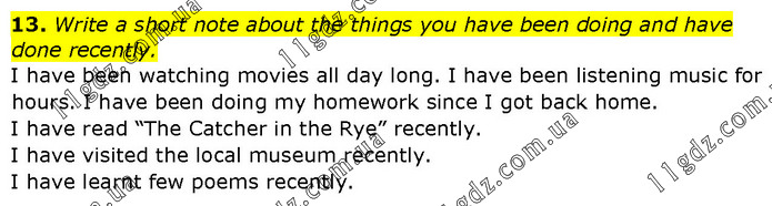 Write a short note about the things you have been doing and have done recently. I have been watching movies all day long. I have been listening music for hours. I have been doing my homework since I got back home. I have read “The Catcher in the Rye” recently. I have visited the local museum recently. I have learnt few poems recently.