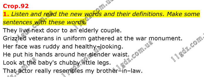 Listen and read the new words and their definitions. Make some sentences with these words. They live next door to an elderly couple. Grizzled veterans in uniform gathered at the war monument. Her face was ruddy and healthy–looking. He put his hands around her slender waist. Look at the baby's chubby little legs. That actor really resembles my brother–in–law.