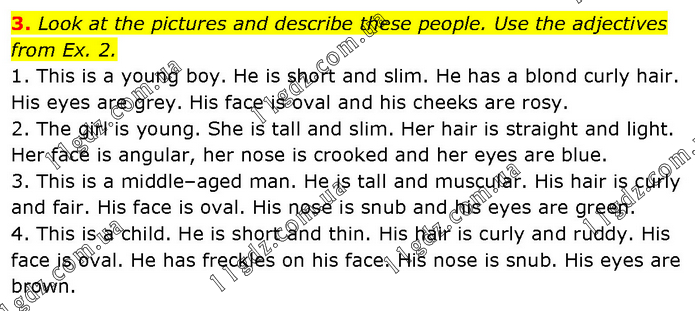 Look at the pictures and describe these people. Use the adjectives from Ex. 2. 1. This is a young boy. He is short and slim. He has a blond curly hair. His eyes are grey. His face is oval and his cheeks are rosy. 2. The girl is young. She is tall and slim. Her hair is straight and light. Her face is angular, her nose is crooked and her eyes are blue. 3. This is a middle–aged man. He is tall and muscular. His hair is curly and fair. His face is oval. His nose is snub and his eyes are green. 4. This is a child. He is short and thin. His hair is curly and ruddy. His face is oval. He has freckles on his face. His nose is snub. His eyes are brown.