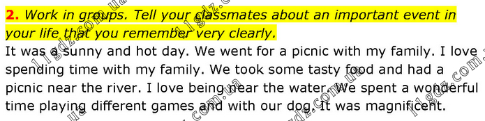 Work in groups. Tell your classmates about an important event in your life that you remember very clearly. It was a sunny and hot day. We went for a picnic with my family. I love spending time with my family. We took some tasty food and had a picnic near the river. I love being near the water. We spent a wonderful time playing different games and with our dog. It was magnificent.