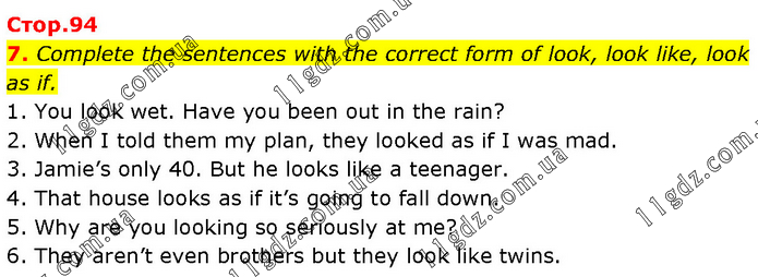 Complete the sentences with the correct form of look, look like, look as if. 1. You look wet. Have you been out in the rain? 2. When I told them my plan, they looked as if I was mad. 3. Jamie’s only 40. But he looks like a teenager. 4. That house looks as if it’s going to fall down. 5. Why are you looking so seriously at me? 6. They aren’t even brothers but they look like twins.