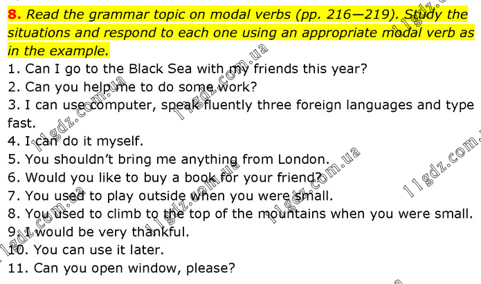 Read the grammar topic on modal verbs (pp. 216—219). Study the situations and respond to each one using an appropriate modal verb as in the example. 1. Can I go to the Black Sea with my friends this year? 2. Can you help me to do some work? 3. I can use computer, speak fluently three foreign languages and type fast. 4. I can do it myself. 5. You shouldn’t bring me anything from London. 6. Would you like to buy a book for your friend? 7. You used to play outside when you were small. 8. You used to climb to the top of the mountains when you were small. 9. I would be very thankful. 10. You can use it later. 11. Can you open window, please?