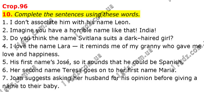 Complete the sentences using these words. 1. I don’t associate him with his name Leon. 2. Imagine you have a horrible name like that! India! 3. Do you think the name Svitlana suits a dark–haired girl? 4. I love the name Lara — it reminds me of my granny who gave me love and happiness. 5. His first name’s José, so it sounds that he could be Spanish. 6. Her second name Teresa goes on to her first name Maria. 7. Joan suggests asking her husband for his opinion before giving a name to their baby.