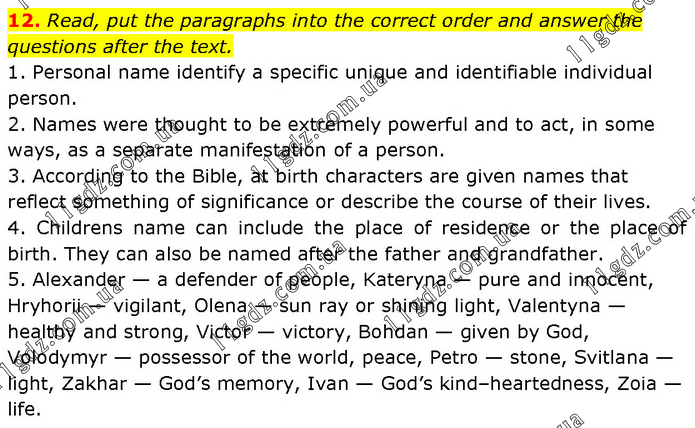 Read, put the paragraphs into the correct order and answer the questions after the text. 1. Personal name identify a specific unique and identifiable individual person. 2. Names were thought to be extremely powerful and to act, in some ways, as a separate manifestation of a person. 3. According to the Bible, at birth characters are given names that reflect something of significance or describe the course of their lives. 4. Childrens name can include the place of residence or the place of birth. They can also be named after the father and grandfather. 5. Alexander — a defender of people, Kateryna — pure and innocent, Hryhorii — vigilant, Olena — sun ray or shining light, Valentyna — healthy and strong, Victor — victory, Bohdan — given by God, Volodymyr — possessor of the world, peace, Petro — stone, Svitlana — light, Zakhar — God’s memory, Ivan — God’s kind–heartedness, Zoia — life.