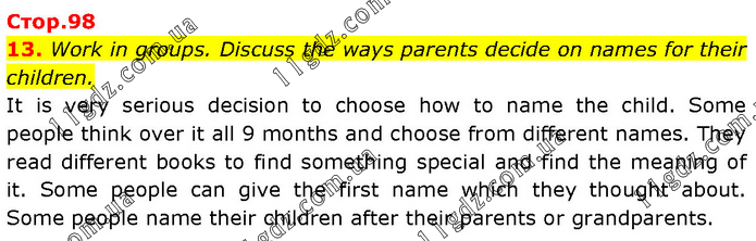 Work in groups. Discuss the ways parents decide on names for their children. It is very serious decision to choose how to name the child. Some people think over it all 9 months and choose from different names. They read different books to find something special and find the meaning of it. Some people can give the first name which they thought about. Some people name their children after their parents or grandparents.