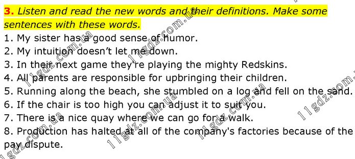 Listen and read the new words and their definitions. Make some sentences with these words. 1. My sister has a good sense of humor. 2. My intuition doesn’t let me down. 3. In their next game they're playing the mighty Redskins. 4. All parents are responsible for upbringing their children. 5. Running along the beach, she stumbled on a log and fell on the sand. 6. If the chair is too high you can adjust it to suit you. 7. There is a nice quay where we can go for a walk. 8. Production has halted at all of the company's factories because of the pay dispute.