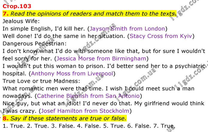 7. Read the opinions of readers and match them to the texts. Jealous Wife: In simple English, I'd kill her. (Jayson Smith from London) Well done! I'd do the same in her situation. (Stacy Cross from Kyiv) Dangerous Pedestrian: I don't know what I'd do with someone like that, but for sure I wouldn't feel sorry for her. (Jessica Morse from Birmingham) I wouldn't put this woman to prison. I'd better send her to a psychiatric hospital. (Anthony Moss from Liverpool) True Love or true Madness: What romantic men were that time. I wish I could meet such a man nowadays. (Catherine Blemish from San Antonio) Nice guy, but what an idiot! I'd never do that. My girlfriend would think I was crazy. (Josef Hamilton from Stockholm) 8. Say if these statements are true or false. 1. True. 2. True. 3. False. 4. False. 5. True. 6. False. 7. True.