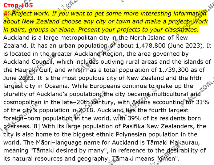 Project work. If you want to get some more interesting information about New Zealand choose any city or town and make a project. Work in pairs, groups or alone. Present your projects to your classmates. Auckland is a large metropolitan city in the North Island of New Zealand. It has an urban population of about 1,478,800 (June 2023). It is located in the greater Auckland Region, the area governed by Auckland Council, which includes outlying rural areas and the islands of the Hauraki Gulf, and which has a total population of 1,739,300 as of June 2023. It is the most populous city of New Zealand and the fifth largest city in Oceania. While Europeans continue to make up the plurality of Auckland's population, the city became multicultural and cosmopolitan in the late–20th century, with Asians accounting for 31% of the city's population in 2018. Auckland has the fourth largest foreign–born population in the world, with 39% of its residents born overseas.[8] With its large population of Pasifika New Zealanders, the city is also home to the biggest ethnic Polynesian population in the world. The Māori–language name for Auckland is Tāmaki Makaurau, meaning "Tāmaki desired by many", in reference to the desirability of its natural resources and geography. Tāmaki means "omen".
