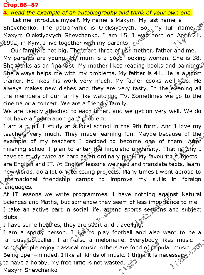 Read the example of an autobiography and think of your own one. Let me introduce myself. My name is Maxym. My last name is Shevchenko. The patronymic is Oleksiyovych. So, my full name is Maxym Oleksiyovych Shevchenko. I am 15. I was born on April 21, 1992, in Kyiv. I live together with my parents. Our family is not big. There are three of us: mother, father and me. My parents are young. My mum is a good–looking woman. She is 38. She works as an financist. My mother likes reading books and painitng. She always helps me with my problems. My father is 41. He is a sport trainer. He likes his work very much. My father cooks well, too. He always makes new dishes and they are very tasty. In the evening all the members of our family like watching TV. Sometimes we go to the cinema or a concert. We are a friendly family. We are deeply attached to each other, and we get on very well. We do not have a “generation gap” problem. I am a pupil. I study at a local school in the 9th form. And I love my teachers very much. They made learning fun. Maybe because of the example of my teachers I decided to become one of them. After finishing school I plan to enter the linguistic university. That is why I have to study twice as hard as an ordinary pupil. My favourite subjects are English and IT. At English lessons we read and translate texts, learn new words, do a lot of interesting projects. Many times I went abroad to international friendship camps to improve my skills in foreign languages. At IT lessons we write programmes. I have nothing against Natural Sciences and Maths, but somehow they seem of less importance to me. I take an active part in social life, attend sports sections and subject clubs. I have some hobbies, they are sport and travelling. I am a sporty person. I like to play football and also want to be a famous footballer. I am also a melomane. Everybody likes music — some people enjoy classical music, others are fond of popular music. Being open–minded, I like all kinds of music. I think it is necessary to have a hobby. My free time is not wasted. Maxym Shevchenko