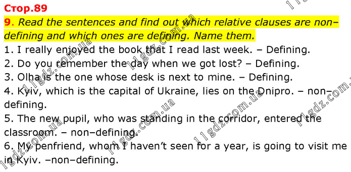 Read the sentences and find out which relative clauses are non–defining and which ones are defining. Name them. 1. I really enjoyed the book that I read last week. – Defining. 2. Do you remember the day when we got lost? – Defining. 3. Olha is the one whose desk is next to mine. – Defining. 4. Kyiv, which is the capital of Ukraine, lies on the Dnipro. – non–defining. 5. The new pupil, who was standing in the corridor, entered the classroom. – non–defining. 6. My penfriend, whom I haven’t seen for a year, is going to visit me in Kyiv. –non–defining.