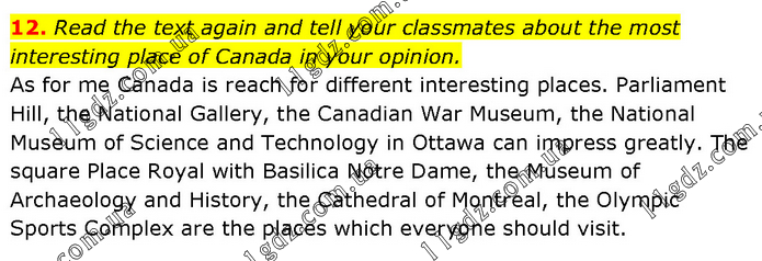 Read the text again and tell your classmates about the most interesting place of Canada in your opinion. As for me Canada is reach for different interesting places. Parliament Hill, the National Gallery, the Canadian War Museum, the National Museum of Science and Technology in Ottawa can impress greatly. The square Place Royal with Basilica Notre Dame, the Museum of Archaeology and History, the Cathedral of Montreal, the Olympic Sports Complex are the places which everyone should visit.