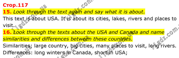 15. Look through the text again and say what it is about. This text is about USA. It is about its cities, lakes, rivers and places to visit. 16. Look through the texts about the USA and Canada and name similarities and differences between these countries. Similarities: large country, big cities, many places to visit, long rivers. Differences: long winters in Canada, short in USA;