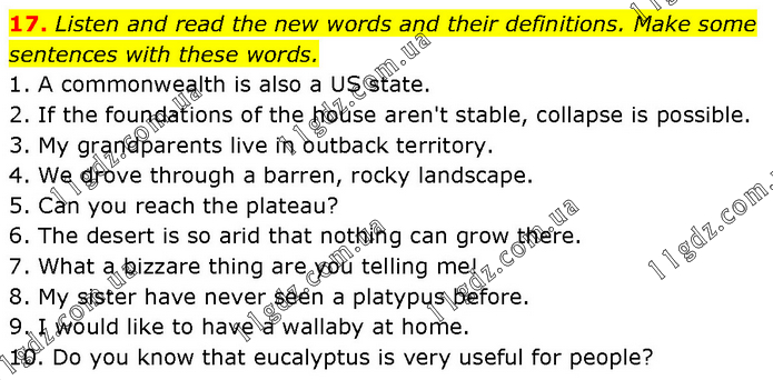 Listen and read the new words and their definitions. Make some sentences with these words. 1. A commonwealth is also a US state. 2. If the foundations of the house aren't stable, collapse is possible. 3. My grandparents live in outback territory. 4. We drove through a barren, rocky landscape. 5. Can you reach the plateau? 6. The desert is so arid that nothing can grow there. 7. What a bizzare thing are you telling me! 8. My sister have never seen a platypus before. 9. I would like to have a wallaby at home. 10. Do you know that eucalyptus is very useful for people?