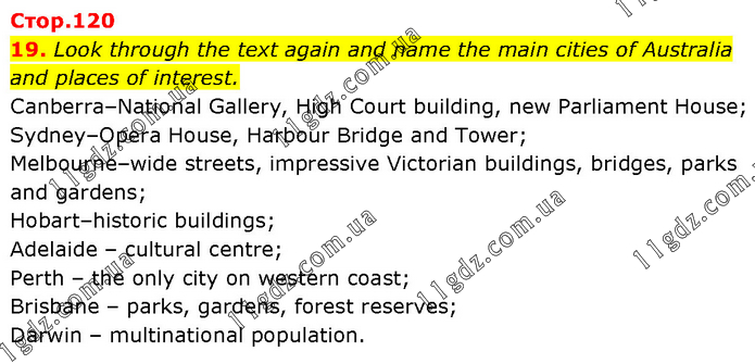 Look through the text again and name the main cities of Australia and places of interest. Сanberra–National Gallery, High Court building, new Parliament House; Sydney–Opera House, Harbour Bridge and Tower; Melbourne–wide streets, impressive Victorian buildings, bridges, parks and gardens; Hobart–historic buildings; Adelaide – cultural centre; Perth – the only city on western coast; Brisbane – parks, gardens, forest reserves; Darwin – multinational population.