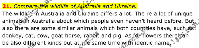 Compare the wildlife of Australia and Ukraine. The wildlife in Australia and Ukraine differs a lot. The re a lot of unique animals in Australia about which people even haven’t heard before. But also there are some similar animals which both countries have, such as: donkey, cat, cow, goat horse, rabbit and pig. As for flowers there can be also different kinds but at the same time with identic name.