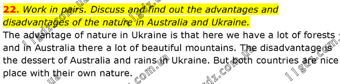 Work in pairs. Discuss and find out the advantages and disadvantages of the nature in Australia and Ukraine. The advantage of nature in Ukraine is that here we have a lot of forests and in Australia there a lot of beautiful mountains. The disadvantage is the dessert of Australia and rains in Ukraine. But both countries are nice place with their own nature.