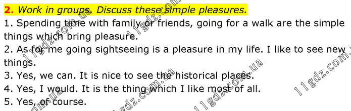 Work in groups. Discuss these simple plеasures. 1. Spending time with family or friends, going for a walk are the simple things which bring pleasure. 2. As for me going sightseeing is a pleasure in my life. I like to see new things. 3. Yes, we can. It is nice to see the historical places. 4. Yes, I would. It is the thing which I like most of all. 5. Yes, of course.