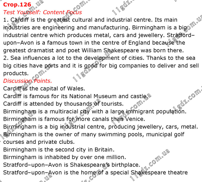 Test Yourself: Content Focus 1. Сardiff is the greatest cultural and industrial centre. Its main industries are engineering and manufacturing. Birmingham is a big industrial centre which produces metal, cars and jewellery. Stratford–upon–Avon is a famous town in the centre of England because the greatest dramatist and poet William Shakespeare was born there. 2. Sea influences a lot to the development of cities. Thanks to the sea big cities have ports and it is good for big companies to deliver and sell products. Discussion Points. Cardiff is the capital of Wales. Cardiff is famous for its National Museum and castle. Cardiff is attended by thousands of tourists. Birmingham is a multiracial city with a large immigrant population. Birmingham is famous for more canals than Venice. Birmingham is a big industrial centre, producing jewellery, cars, metal. Birmingham is the owner of many swimming pools, municipal golf courses and private clubs. Birmingham is the second city in Britain. Birmingham is inhabited by over one million. Stratford–upon–Avon is Shakespeare’s birthplace. Stratford–upon–Avon is the home of a special Shakespeare theatre