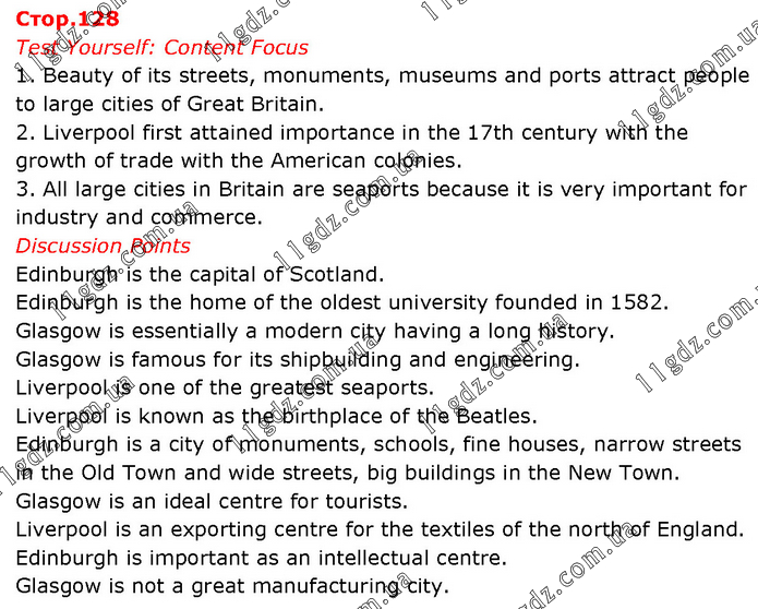 Test Yourself: Content Focus 1. Beauty of its streets, monuments, museums and ports attract people to large cities of Great Britain. 2. Liverpool first attained importance in the 17th century with the growth of trade with the American colonies. 3. All large cities in Britain are seaports because it is very important for industry and commerce. Discussion Points Edinburgh is the capital of Scotland. Edinburgh is the home of the oldest university founded in 1582. Glasgow is essentially a modern city having a long history. Glasgow is famous for its shipbuilding and engineering. Liverpool is one of the greatest seaports. Liverpool is known as the birthplace of the Beatles. Edinburgh is a city of monuments, schools, fine houses, narrow streets in the Old Town and wide streets, big buildings in the New Town. Glasgow is an ideal centre for tourists. Liverpool is an exporting centre for the textiles of the north of England. Edinburgh is important as an intellectual centre. Glasgow is not a great manufacturing city.