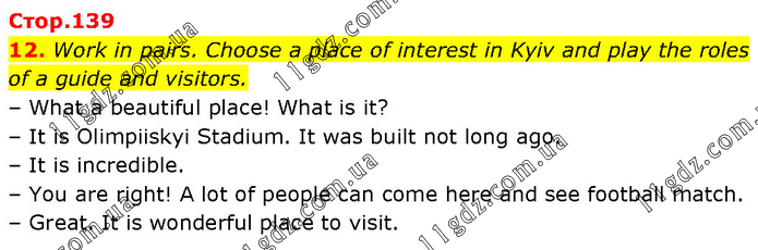 Work in pairs. Choose a place of interest in Kyiv and play the roles of a guide and visitors. – What a beautiful place! What is it? – It is Olimpiiskyi Stadium. It was built not long ago. – It is incredible. – You are right! A lot of people can come here and see football match. – Great. It is wonderful place to visit.