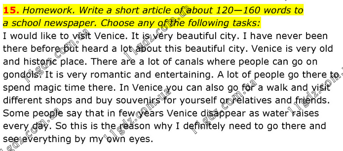 Homework. Write a short article of about 120—160 words to a school newspaper. Choose any of the following tasks: I would like to visit Venice. It is very beautiful city. I have never been there before but heard a lot about this beautiful city. Venice is very old and historic place. There are a lot of canals where people can go on gondols. It is very romantic and entertaining. A lot of people go there to spend magic time there. In Venice you can also go for a walk and visit different shops and buy souvenirs for yourself or relatives and friends. Some people say that in few years Venice disappear as water raises every day. So this is the reason why I definitely need to go there and see everything by my own eyes.