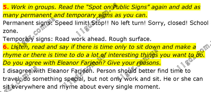 5. Work in groups. Read the “Spot on Public Signs” again and add as many permanent and temporary signs as you can. Permanent signs: Speed limit! Stop!! No left turn! Sorry, closed! School zone. Temporary signs: Road work ahead. Rough surface. 6. Listen, read and say if there is time only to sit down and make a rhyme or there is time to do a lot of interesting things you want to do. Do you agree with Eleanor Farjeon? Give your reasons. I disagree with Eleanor Farjeon. Person should better find time to travel, do something special, but not only work and sit. He or she can sit everywhere and rhyme about every single moment.