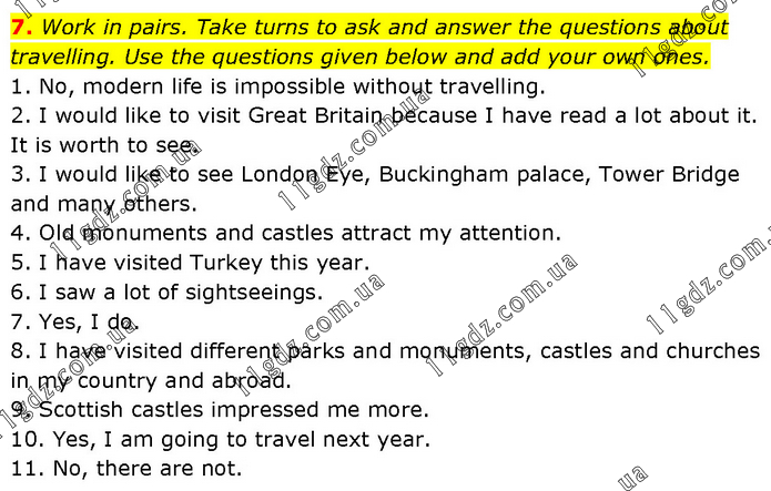 Work in pairs. Take turns to ask and answer the questions about travelling. Use the questions given below and add your own ones. 1. No, modern life is impossible without travelling. 2. I would like to visit Great Britain because I have read a lot about it. It is worth to see. 3. I would like to see London Eye, Buckingham palace, Tower Bridge and many others. 4. Old monuments and castles attract my attention. 5. I have visited Turkey this year. 6. I saw a lot of sightseeings. 7. Yes, I do. 8. I have visited different parks and monuments, castles and churches in my country and abroad. 9. Scottish castles impressed me more. 10. Yes, I am going to travel next year. 11. No, there are not.